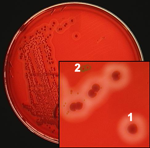 OK, so you streaked the sample on Blood Agar and MacConkey plates. You incubate the plates overnight at 37 C. Here is an image of the blood agar plate from case 1. Two different colony types - #1 and #2 - are labeled (note that two colonies of #2 are located near the label). We'll deal with the MacConkey plate later.