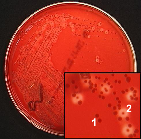 OK, so you streaked the sample on Blood Agar and MacConkey plates. You incubate the plates overnight at 37 C. Here is an image of the blood agar plate from case 1. Two different colony types - #1 and #2 - are labeled (note that two colonies of #2 are located near the label). We'll deal with the MacConkey plate later. Actually, there is a third colony type marked with a *, but we'll deal with that at the end of this case.